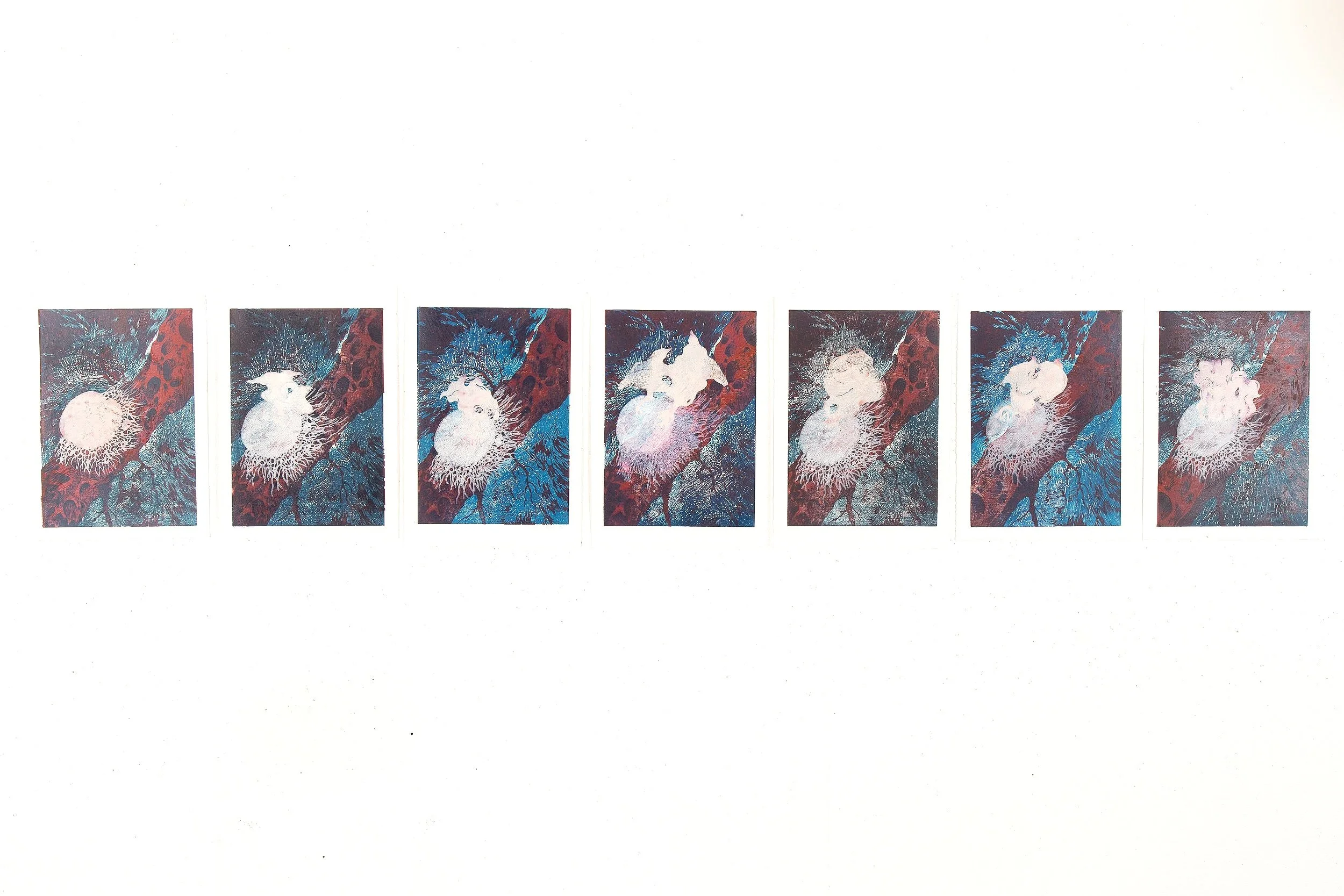 This set of seven relief prints represents both the seven days of a week and an allegorical microcycle about life, death and rebirth; an intricate process in which each organism weaves a singular, irreplaceable narrative. When viewed from a broader perspective, however, life adheres not to an eternal cycle, but a finite sequence. This artwork invites viewers to contemplate and meditate upon the present and its swift pace. Do we truly have time to grasp the essence of life?