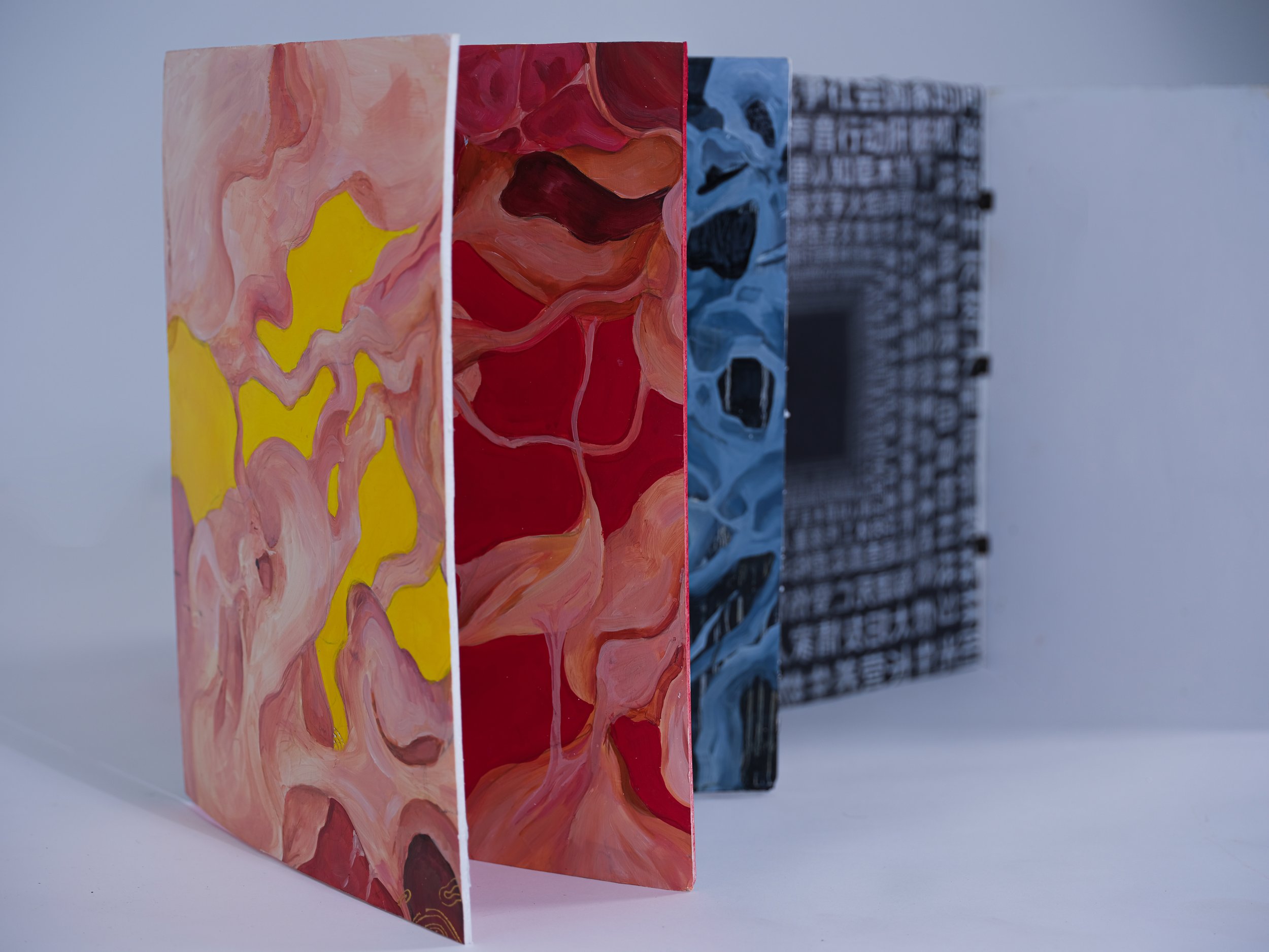 Envisions the body as a poetic anthology woven with the essence of bones, blood, and flesh; traversing the depths from skin to blood, flesh to bone, and finally, the inner spirit. Transcending external matter, the viewer peruses this book until the last page, its blankness akin to a question, inviting contemplation and questioning what awaits beneath the spirit. This interactive exploration of the soul assists the observer in reflecting upon the existence of life, merging with the profundity of the inner self, resonating with the subtle essence of one’s own existence.